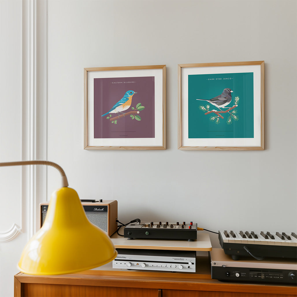 This elegant Art Deco-inspired print showcases a Dark Eyed Junco in sleek, modern geometric shapes with a mid-century modern flair. The vibrant yet stylized design makes a striking statement while fitting seamlessly into contemporary or vintage-inspired décor.