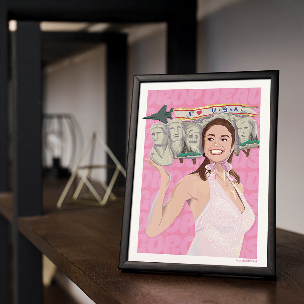 This art print captures the unforgettable image of Denise Richards in Drop Dead Gorgeous, donning the iconic Mount Rushmore display atop her head. It’s a perfect blend of pageant glamor, small-town satire, and Midwest pride—all set in the heart of Minnesota, where the cult-favorite film was shot.