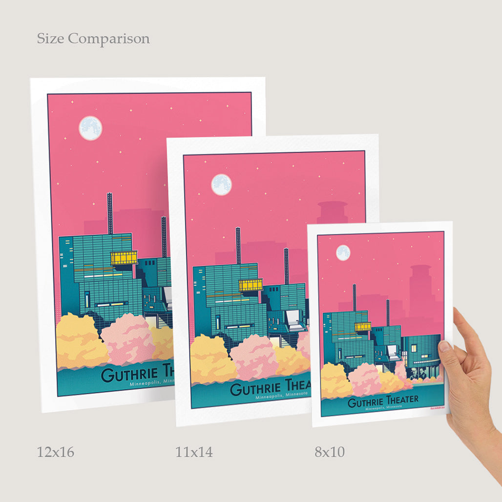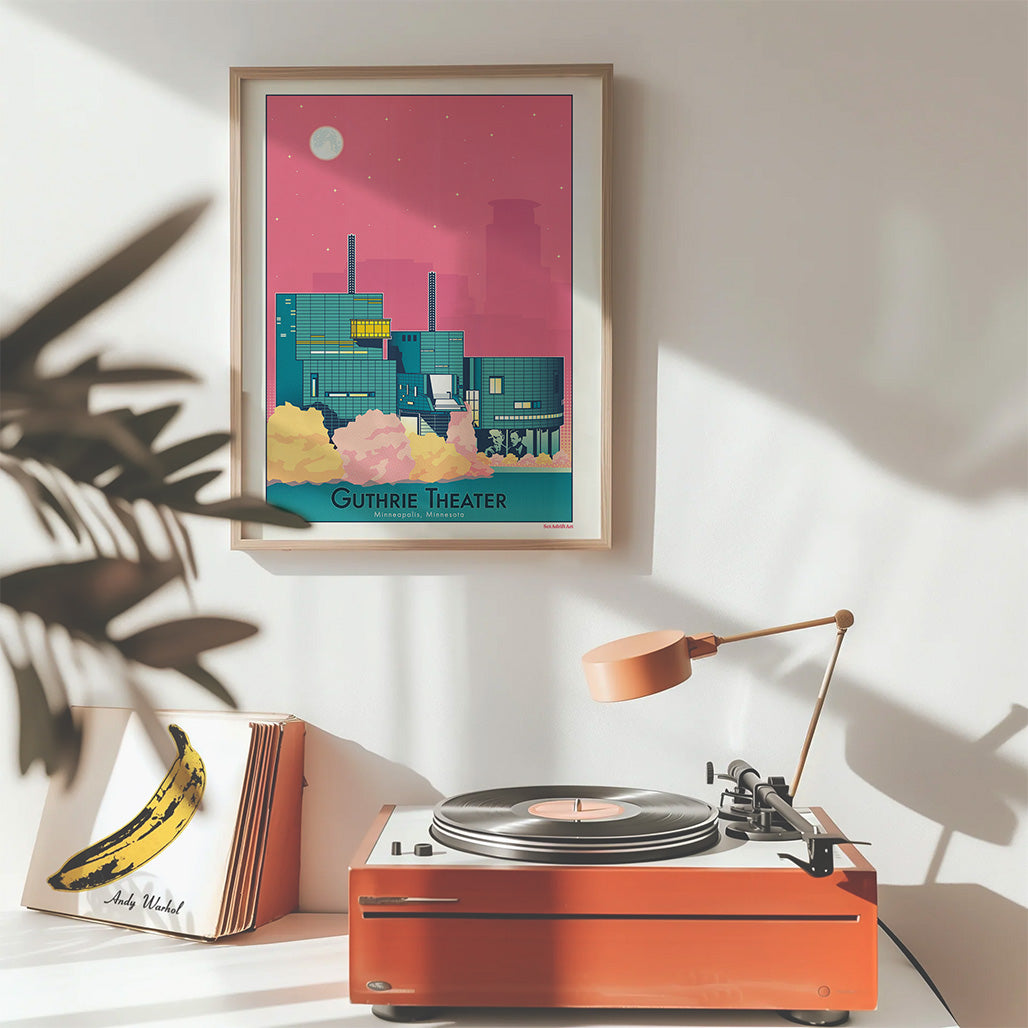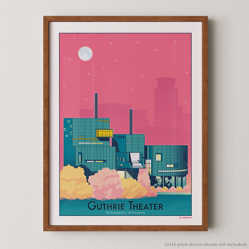 The Iconic Guthrie Theater, a striking Minnesota landmark overlooking the Mississippi River in downtown Minneapolis. This vivid art print celebrates the theater’s bold architecture and cultural significance, rendered in bright colors and sharp detail.