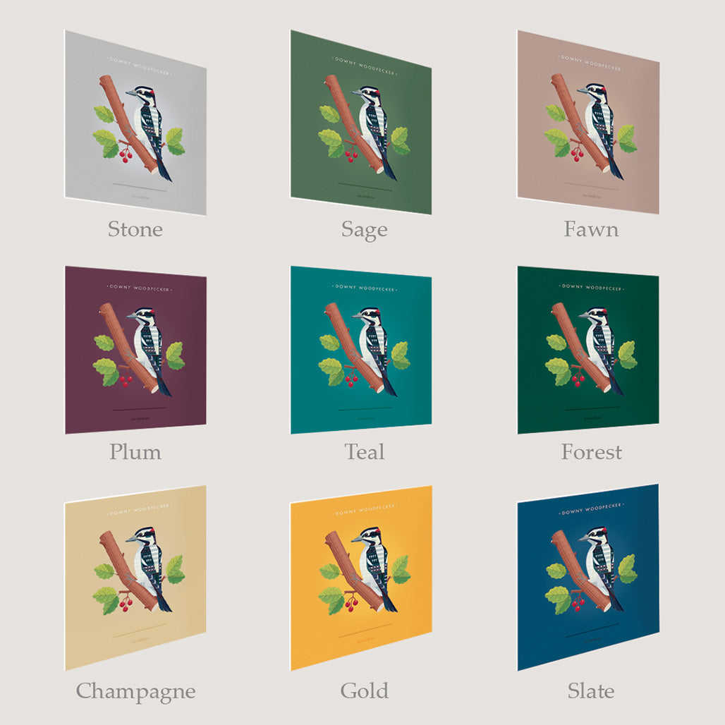 This elegant Art Deco-inspired print showcases a Downy Woodpecker rendered in sleek, modern geometric shapes with a mid-century modern flair. The vibrant yet stylized design makes a striking statement while fitting seamlessly into contemporary or vintage-inspired décor.