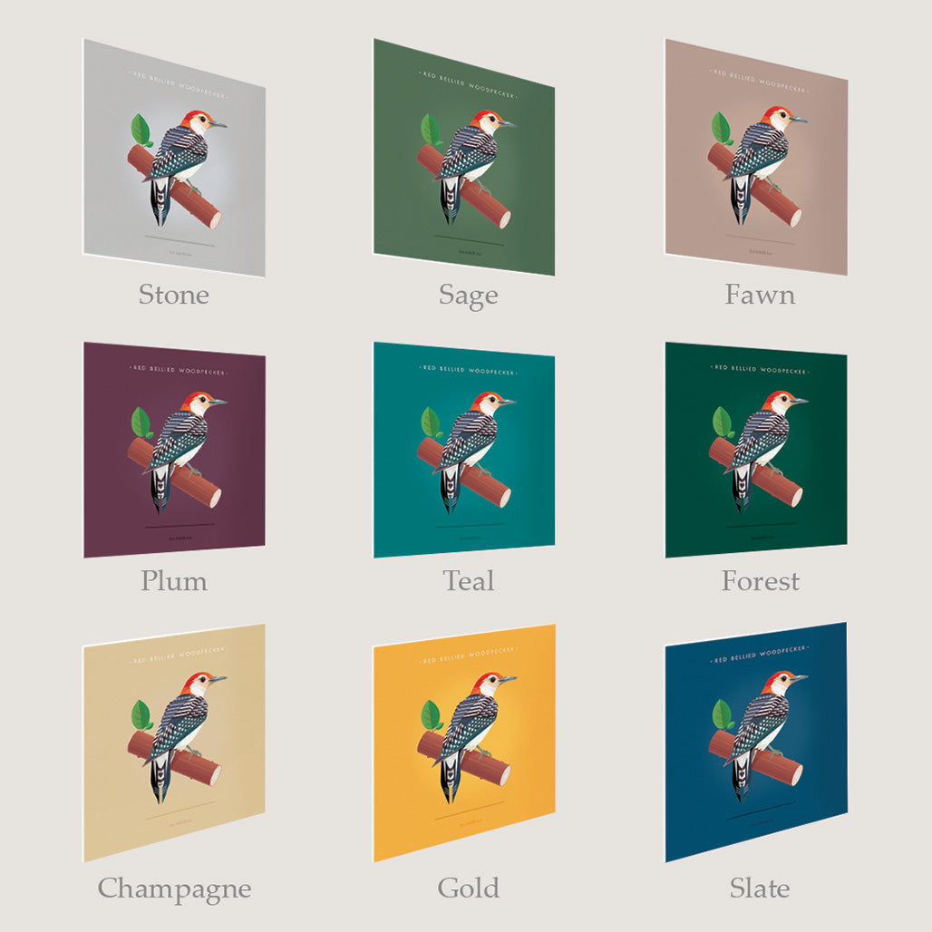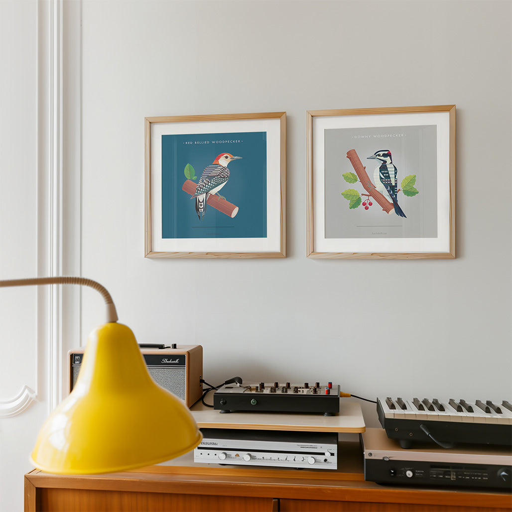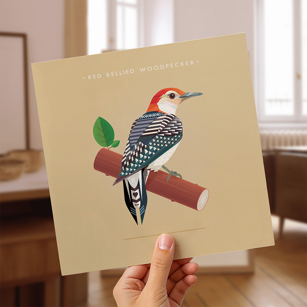 This elegant Art Deco-inspired print showcases a Red Bellied Woodpecker rendered in sleek, modern geometric shapes with a mid-century modern flair. The vibrant yet stylized design makes a striking statement while fitting seamlessly into contemporary or vintage-inspired décor.