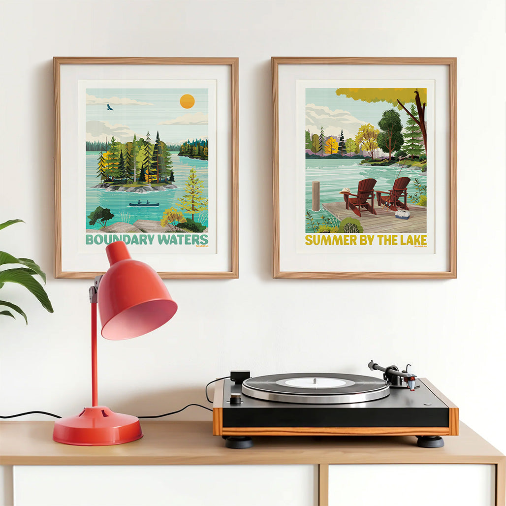 This tranquil art print captures the essence of Minnesota cabin life—two Adirondack chairs looking out over a calm northern lake. It’s a familiar scene for anyone who’s spent time “up north,” where the days slow down and the only agenda is watching the sunset on the water.